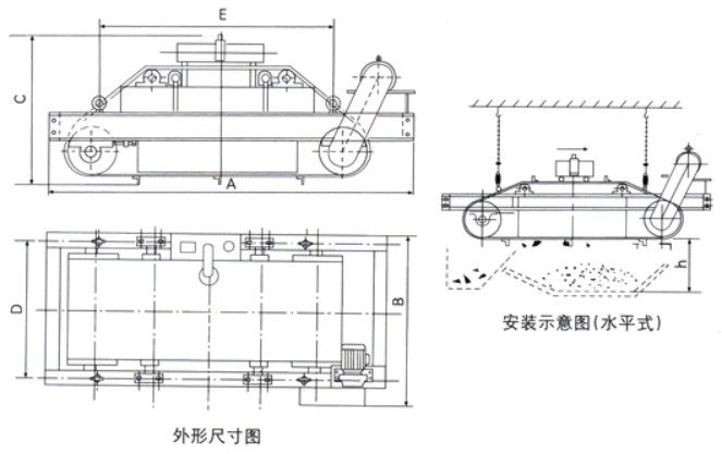 型號 | 項目 → | 適應(yīng)帶寬 | 額定吊高 | 物料厚度 | 勵磁功率 | 驅(qū)動功率 | 外形尺寸mm | ||||